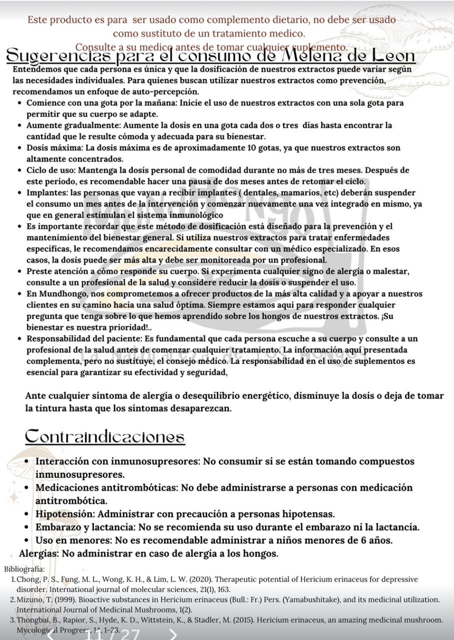 Elaboramos esta tintura en solución hidroalcohólica a base de extractos premium de hongos Melena de León, reconocido por mejorar la salud cognitiva y las funciones cerebrales.